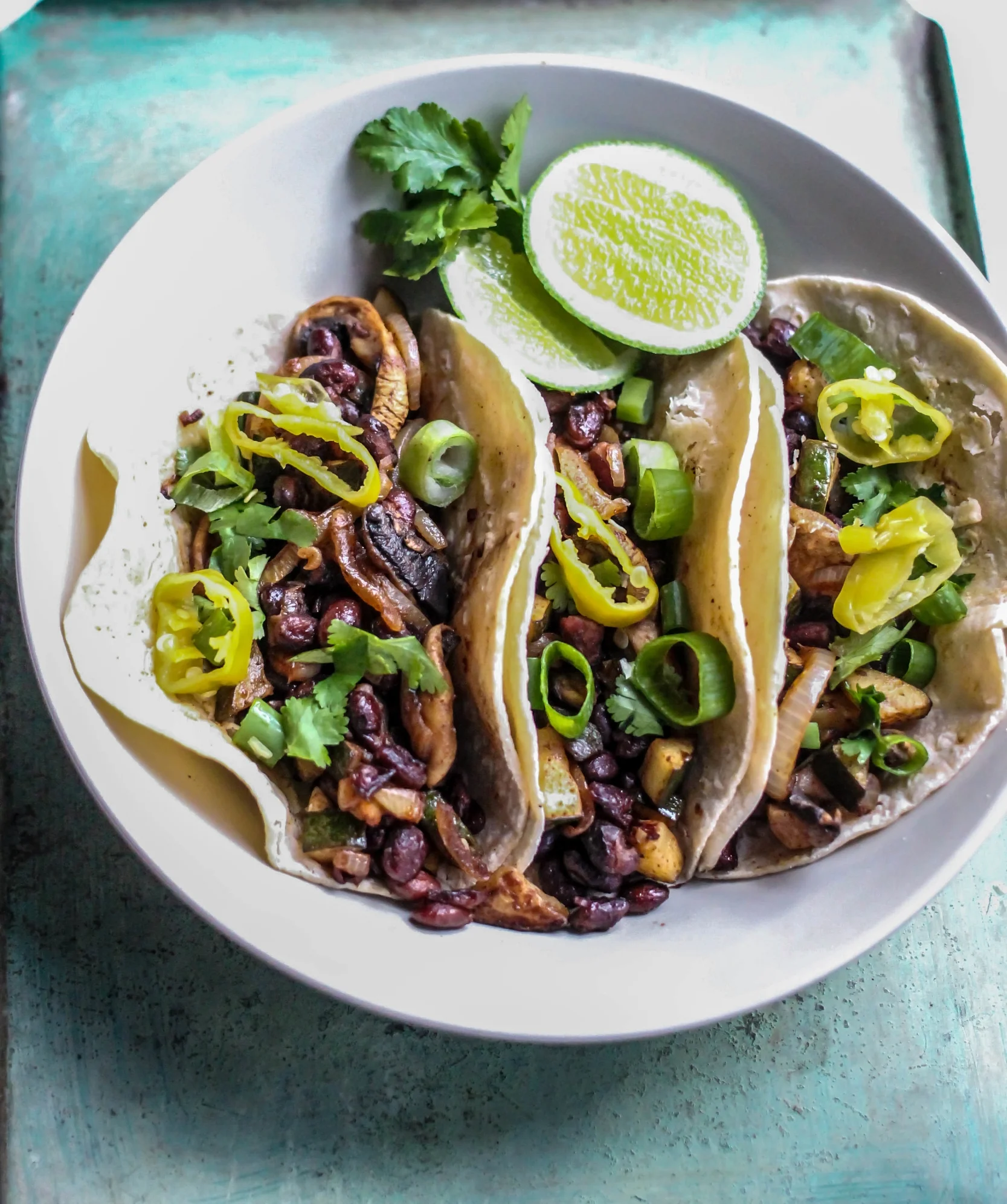 Ancho Spiced Zucchini, Mushroom + Black Bean Tacos