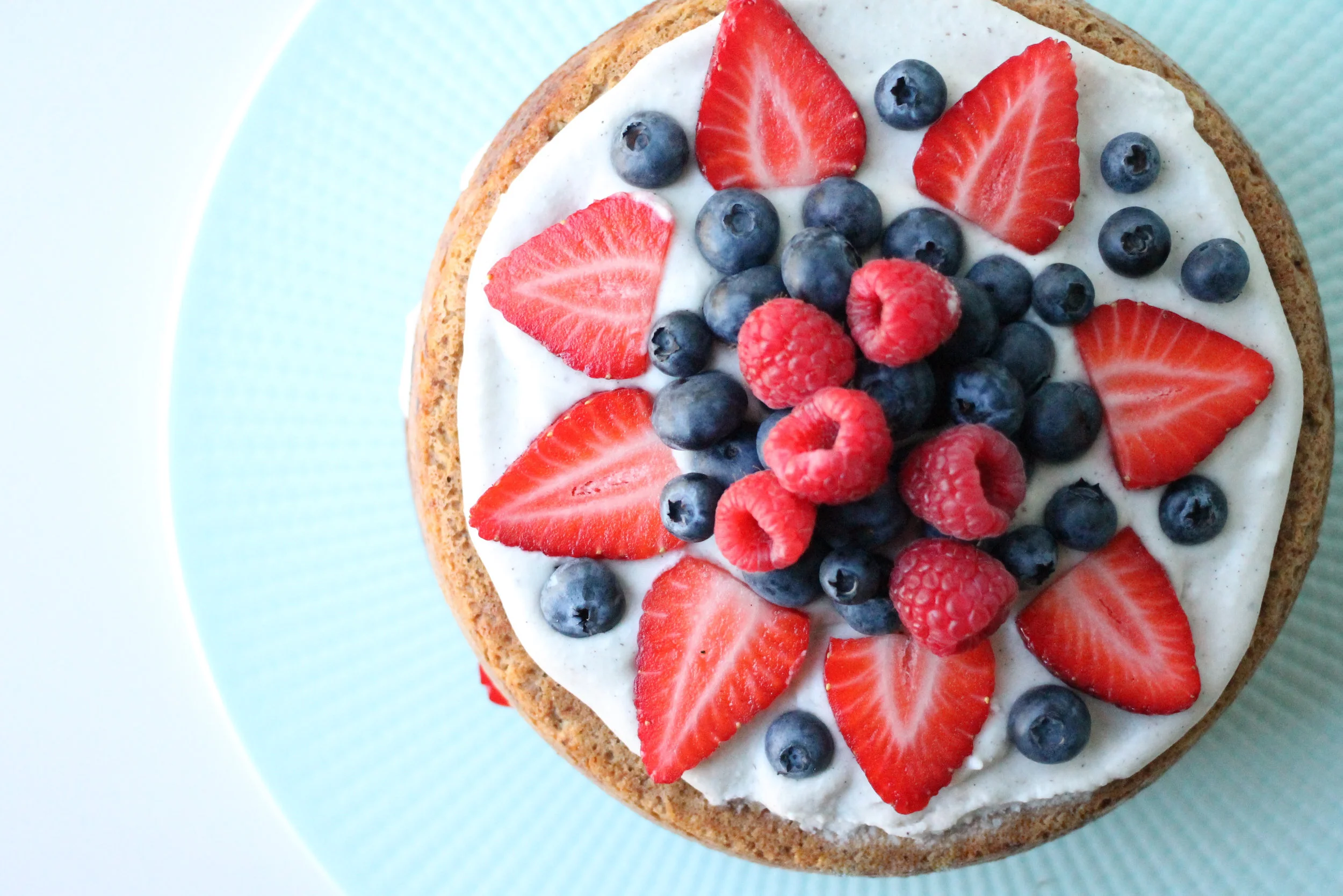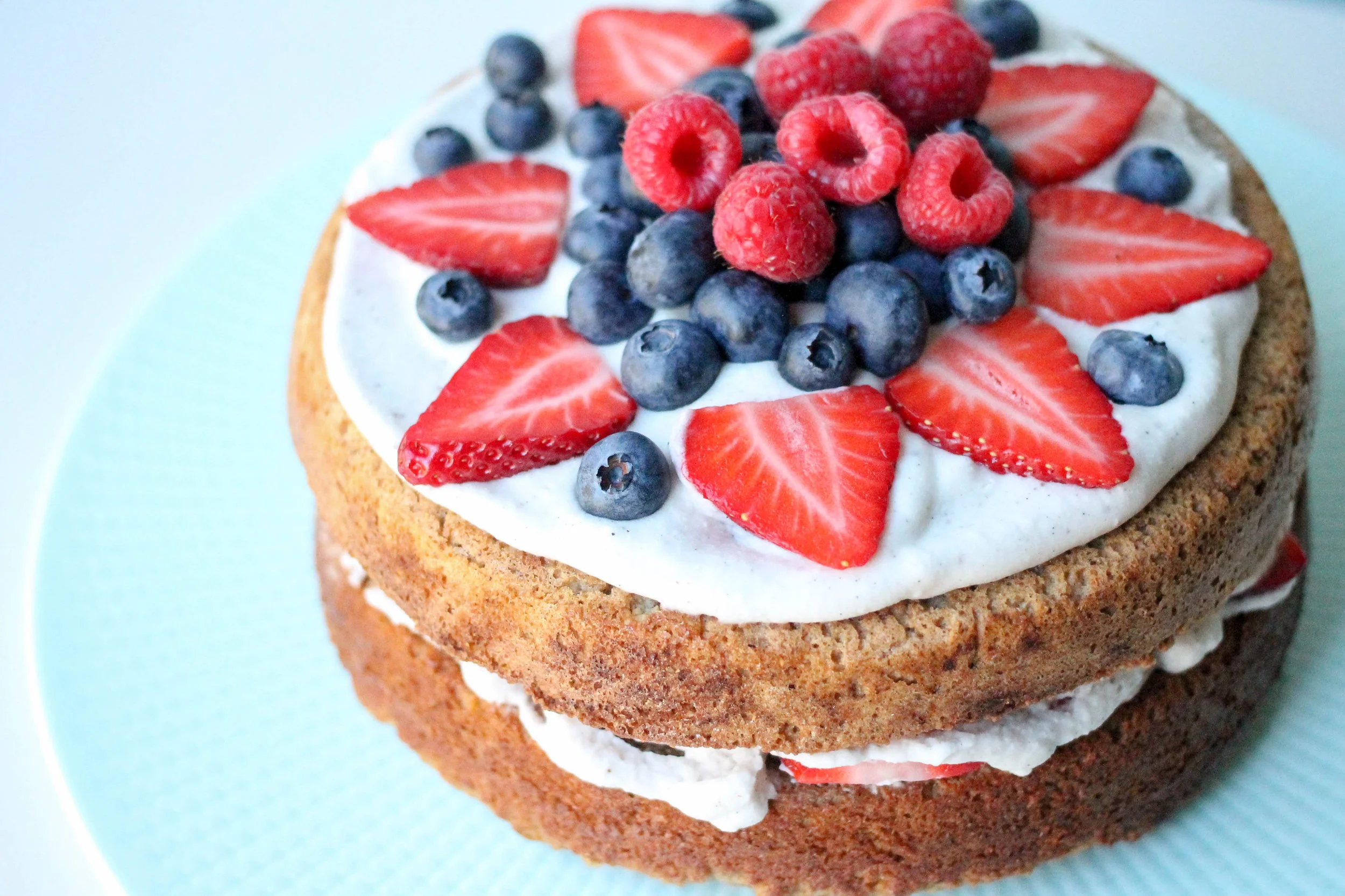 Top cake with cream and lay berries in a single layer. Place second cake layer on top. Spread remaining coconut cream, smoothing out cream with a spatula or butter knife. Decorate with remaining berries.